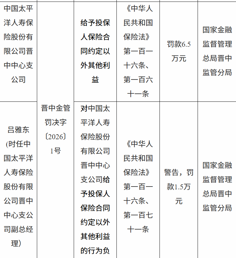 2月6日,国家金融监督管理总局晋中监管分局行政处罚信息公开表显示,中国太平洋人寿保险股份有限公司晋中中心支公司因给予投保人保险合同约定以外其他利益被罚款6.5万元。责任人吕某东被警告并罚款1.5万元。